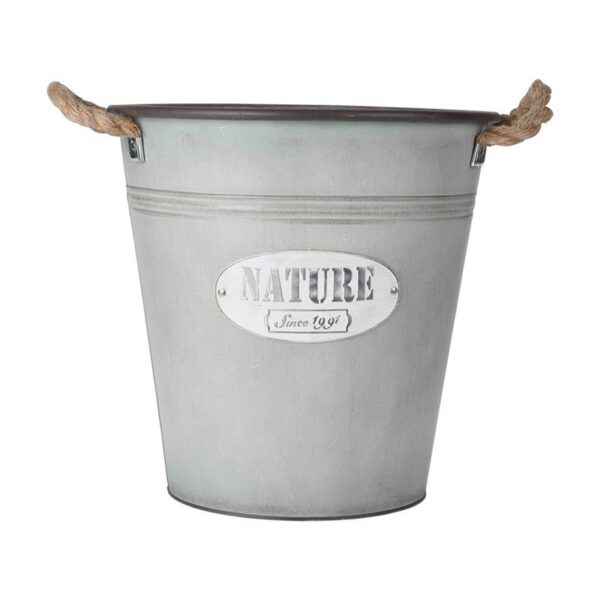 Wykonana z metalu, cynkowa osłonka w kształcie wiaderka na kwiaty, z uchwytami ze sznura o wymiarach: 29,5x30 cm
