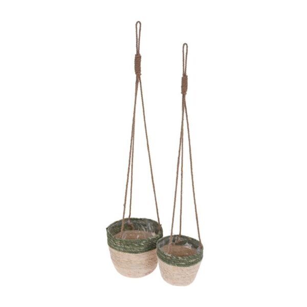 Komplet 2 szt kwietników wiszących na sznurze z donicą, wykonanych z trawy morskiej w kolorze beżowo-zielonym w stylu Boho o długości 80 cm