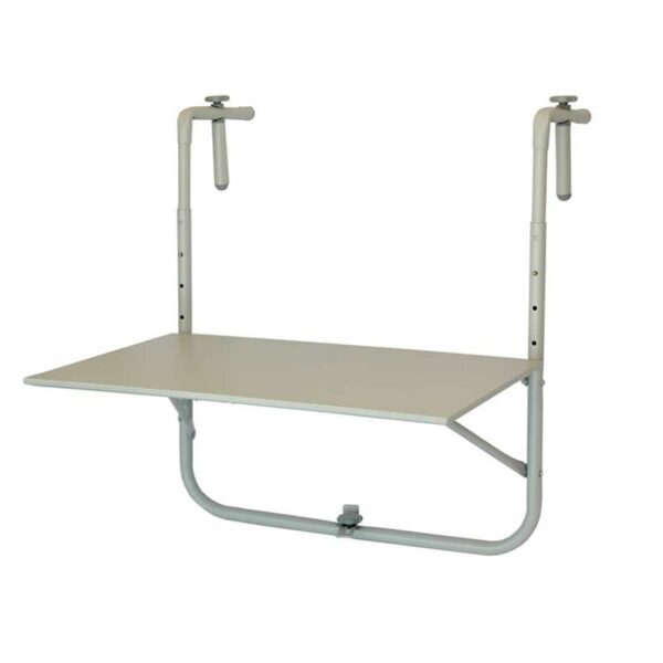 Praktyczny stolik balkonowy wykonany ze stali, składany, regulowana wysokość blatu, metalowe uchwyty, w kolorze matowej szarości o wymiarach blatu: 60x40 cm