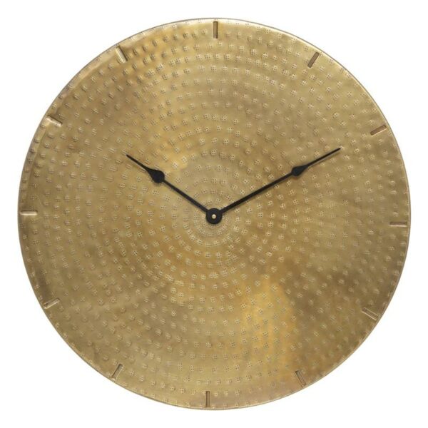 W kolorze złotym, minimalistyczna tarcza pozbawiona oznaczenia godzin, funkcjonalny oraz stylowo wyglądający dodatek do wnętrz