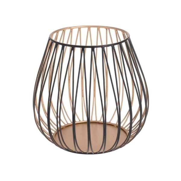 Druciany, ażurowy lampion na świece w kolorze czarno-złotym o wymiarach: 17,5x16 cm