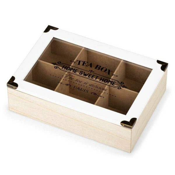 Pojemnik na herbatę, organizer z 6 przegródkami, wykonany z drewna oraz mdf, z przeszkloną szybką