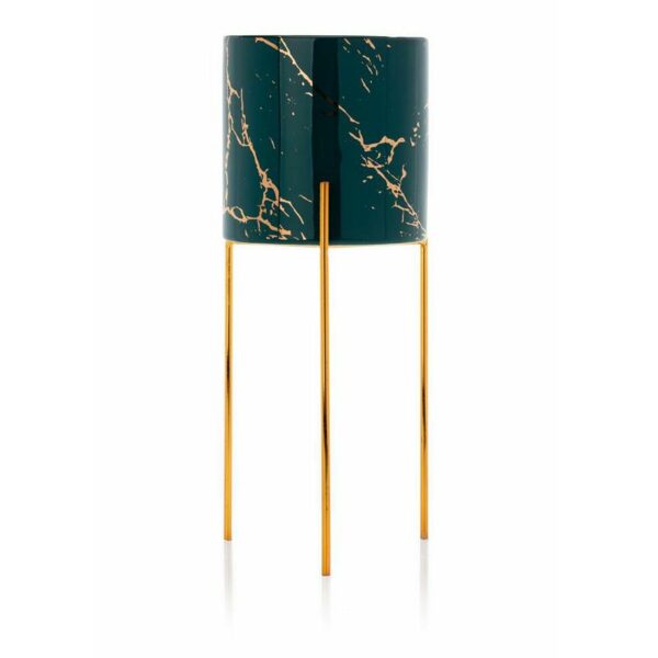 Osłonka wykonana z ceramiki w kolorze zielono-złotym. Stojak wykonany z metalu w kolorze złotym. Całkowita wysokość zestawu wynosi 28 cm.