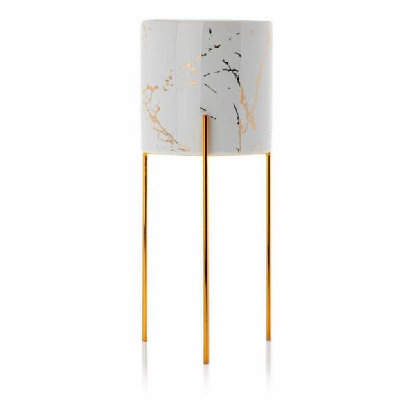 Osłonka wykonana z ceramiki w kolorze biało-złotym. Stojak wykonany z metalu w kolorze złotym. Całkowita wysokość zestawu wynosi 28 cm.