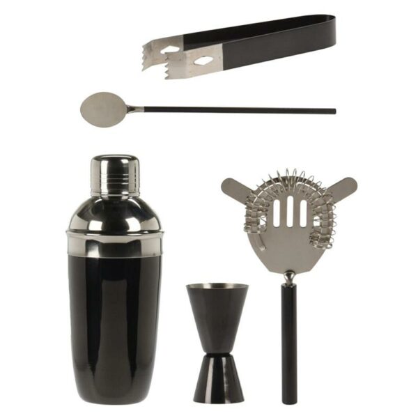 Zestaw barmański w stylu loft, wykonany ze stali nierdzewnej w kolorze czarno-srebrnym z połyskiem, zawierający: shaker, szczypce, sitko, miarka, łyżeczka