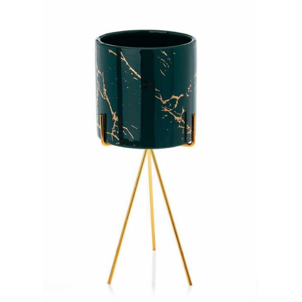 Wykonana z ceramiki w kolorze zielonym, uchwyt doniczki wykonano z metalu w odcieniu złotego koloru. Całkowita wysokość zestawu wynosi 32 cm.