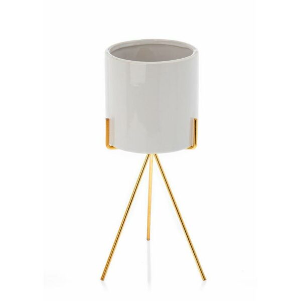 Wykonana z ceramiki w kolorze białym, uchwyt doniczki wykonano z metalu w odcieniu złotego koloru. Całkowita wysokość zestawu wynosi 28 cm.