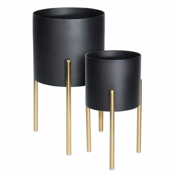 Komplet kwietników metalowych z donicą, donice na nóżkach w kolorze czarnym na złotym stojaku o wymiarach: 36x19 cm; 31x15,5 cm