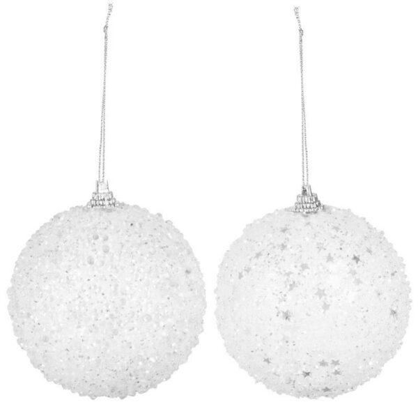 Zestaw dekoracyjnych, nietłukących bombek choinkowych w kształcie kul, zdobione koralikami i cekinami, w białym kolorze, o średnicy: 8 cm