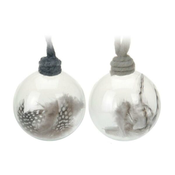 Zestaw dekoracyjnych bombek choinkowych wykonanych z transparentnego szkła z ozdobnymi piórkami o średnicy 8 cm