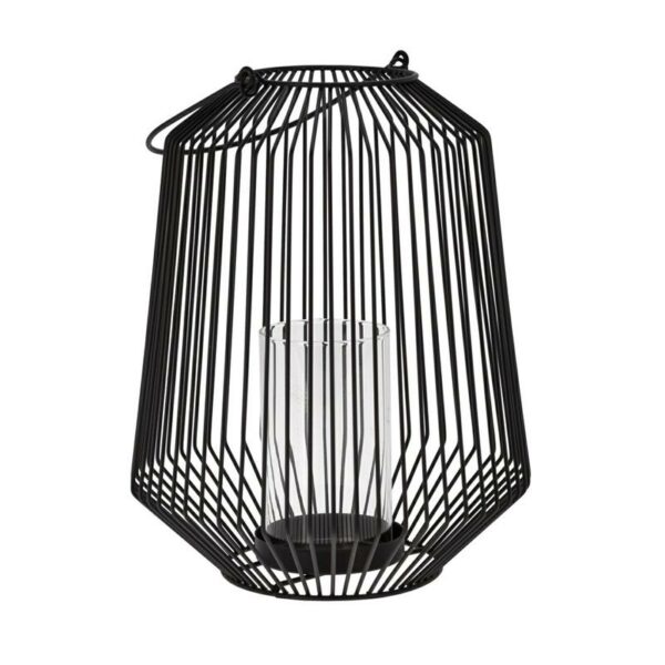 Latarenka wykonana z metalu w kolorze czarnym, posiada szklany wkład na świece