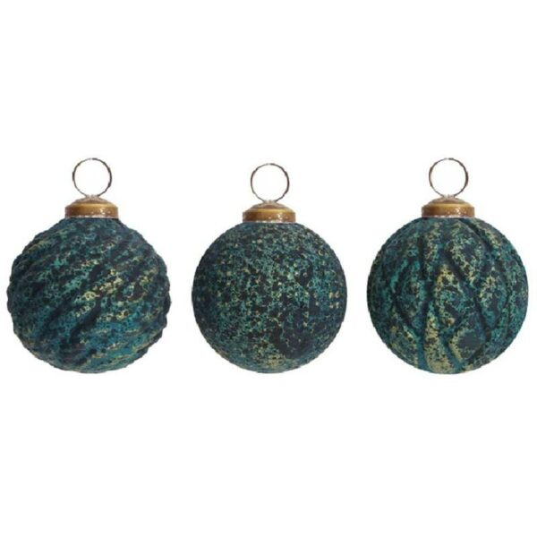 Zestaw dekoracyjnych, szklanych bombek w kształcie kul z pięknym wytłaczanym wzorem w stylu vintage z zawieszką w kolorze starego złota, o średnicy 8 cm