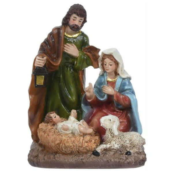 Urocza, kolorowa szopka bożonarodzeniowa z postaciami Maryi, Józefa i Dzieciątka Jezus do dekoracji świątecznych, wykonana z polyresinu o wymiarach: 13x8,5x6 cm