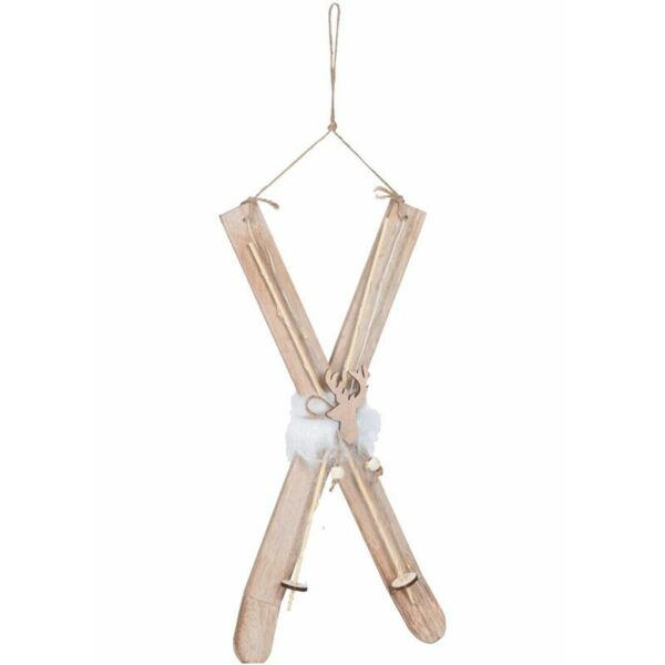 Drewniana ozdoba świąteczna w kolorze beżowym, narty ozdobione kijkami oraz motywem jelenia, całość opleciona lampkami LED