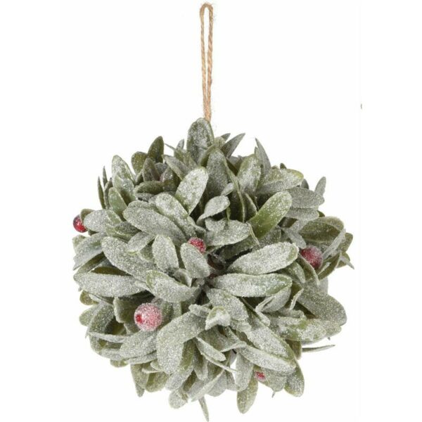 Dekoracyjna zawieszka w formie kuli, ośnieżone liście ozdobione owocami jemioły, jutowy sznurek do zawieszenia, średnica 11 cm