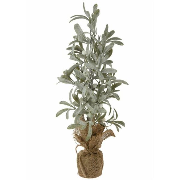 Świąteczna dekoracja w formie drzewka z jemioły, ozdobiona białymi owocami, podstawa pokryta materiałem z juty, wysokość drzewka 45 cm