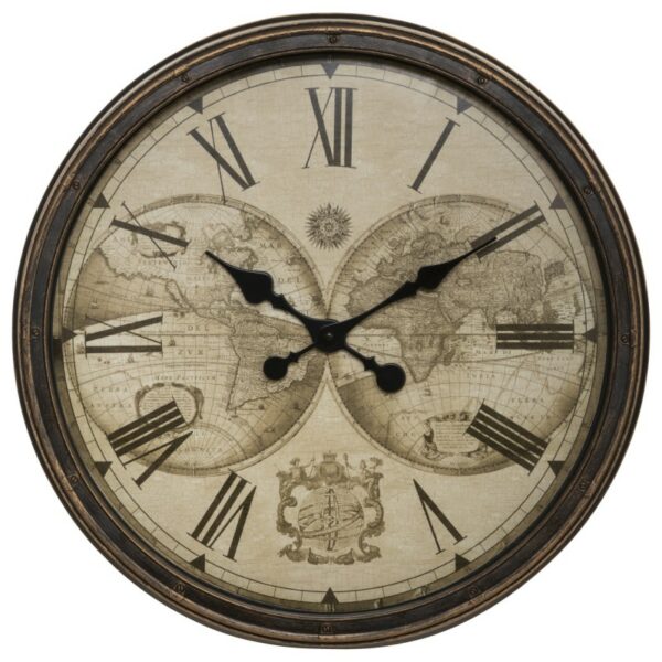 Dekoracyjny zegar do powieszenia na ścianie, tarcza zdobiona motywem ziemskiego globu, rzymskie cyfry, styl vintage