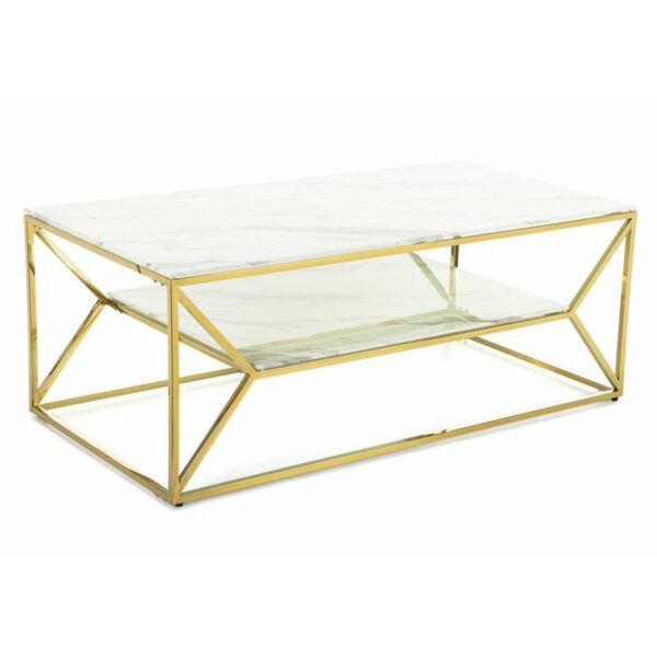 Rama stolika wykonana ze stali nierdzewnej w kolorze złotym, biały blat ze szkła hartowanego ozdobiony motywem marmuru.