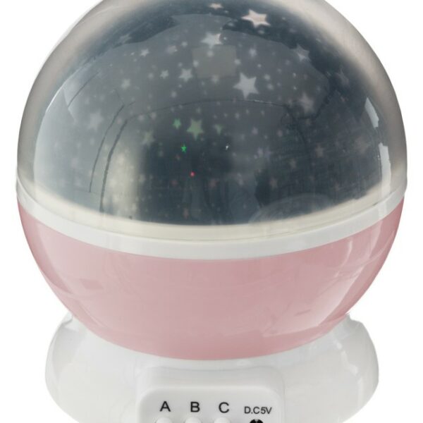 Niewielki projektor do pokoju dziecka z funkcją lampki, wyświetlający na ścianach i suficie obraz rozgwieżdżonego nieba, zasilany na baterie