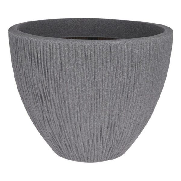 Nowoczesna, okrągła osłonka na kwiaty wykonana z mocnego tworzywa imitującego kamień o wysokości 31 cm i średnicy 40 cm