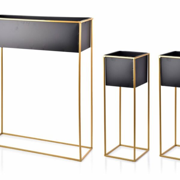 Komplet trzech osłonek na doniczkę w zestawie ze stojakami, dekoracyjny dodatek do wnętrz, na taras lub balkon, całość wykonana z metalu