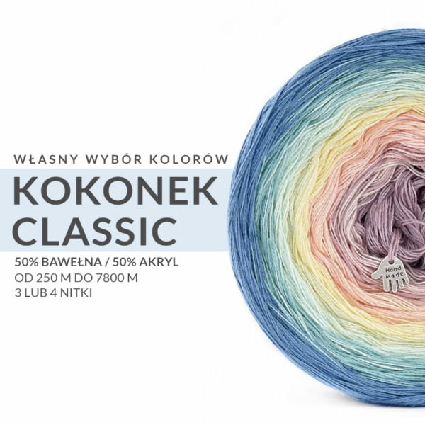 Włóczka z długimi przejściami kolorystycznymi z efektem ombre. Motek jest nawijany ręcznie i składa się z kilku nitek, które nie są skręcone.Zmiana koloru następuje nitka po nitce. Kolory: Własny wybór - maksymalnie 6 kolorów. (przy długościach powyżej 1500 m akceptujemy też wybory 7 kolorowe) Dostępne kolory widoczne są na kartach kolorów - 3 karty Mieszaj dowolnie kolory z kart! Wypełnij tyle pól ile potrzebujesz kolorów. Np. Potrzebujesz Kokonek Szary/Turkus/Biel w którym są 3 kolory więc wypełniasz 3 pola, pozostałe pola zostawiasz puste. UWAGA! Zdjęcia kolorów poglądowe. W przypadku braku koloru, NIE znajdziesz go na liście rozwijanej. Kolory z palety bawełna/akryl*: I karta kolorówFiolet, Cyklamen, Jasny fiolet, Blady fiolet, Fiołek, Wrzos, Ametyst, Brudny róż, Lawenda, Morela, Brzoskwinia, Łososiowy róż, Pastelowy róż, Jasny róż, Róż, Malinowy róż, Neonowy róż, Fuksja, Piwonia, Gorący róż, Jeżyna, Rubin, Czerwień, Ognista czerwień, Koral, Mango, Intensywna pomarańcz, Pomarańcz, Intensywny żółty, Żółty, Wanilia, Kurkuma, Musztarda, Koniak, RdzaII karta kolorów Cegła, Burgund, Kasztan, Malaga, Wino, Czekolada, Brąz, Orzech, Ciepły brąz , Ciepły beż, Jasny beż, Pudrowy beż, Krem, Zimny beż, Ciemny beż, Szarobeżowy, Brązowoszary, Khaki, Butelkowa zieleń, Absynt, Wojskowa zieleń, Paproć, Zielone jabłuszko, Zieleń, Jasna zieleń, Kiwi, Neonowa zieleń, Limetka, Pistacja, Jasna pistacja, Mięta, Patyna, Turkus, Szmaragd, Morski, Ciemny szmaragd, Jasny petrol, PetrolIII karta kolorówGranat, Kobalt, Szafir, Lazur, Cyjan, Denim, Atrament, Niebieski, Jasny niebieski, Błękit, Jasny błękit, Biel, Jasny szary, Szary, Średni szary, Ciemny szary, Czerń, Ciemny szary melanż, Średni szary melanż, Szary melanż, Beż melanż, Brąz melanż, Jeans melanż, Indygo Melanż, Navy melanż, Lapis, Neonowy pomarańcz, Neonowy żółty, Ultra fiolet, Ultra róż W przypadku wyboru dodatkowego koloru - zostanie on nakręcony jako oddzielna sztuka. *UWAGA: Jest to jedynie lista kolorów będących w palecie danej przędzy. Dostępność kolorów jest ruchoma i może się zmieniać. Chcesz zobaczyć kolory na żywo? Możesz zamówić pełną paletę kolorów tej przędzy lub 10 wybranych. Pełna paleta - tutaj 10 wybranych kolorów - tutaj - w wybrane kolory należy wpisać w komentarzu Aby zamówić wybierz długość motka pod ceną. Przykłady: 800 m włóczki - chusta średniej wielkości1000/1200 m włóczki - duża chusta Uwaga! Do Kokonka może zostać dodana TYLKO 1 nić dodatkowa! W przypadku dodania nici z nopkami, Kokonek z uwagi na wielkość może zostać podzielony na dwa motki. Staramy się zachować ciągłość kolorów, jednak może się zdarzyć inny odcień z uwagi na zmiany w dostawach przędzy. Kokonki powyżej 2tyś. metrów ze względów technicznych mogą zostać podzielone na 2 motki.