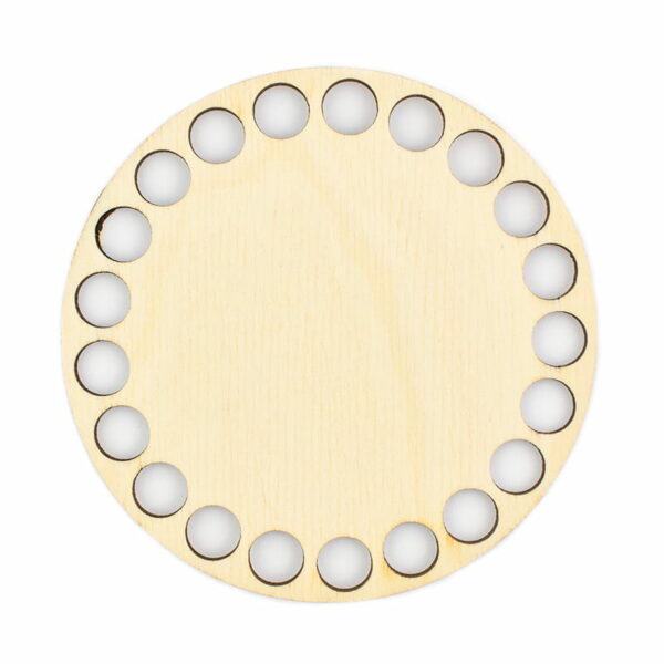 Baza dno koszyka do obrabiania sznurkiem, wykonana ze sklejki o grubości 3 mm. Do tej bazy polecamy sznurek bawełniany lub T-shirt Cotton Spaghetti. Bazy można malować farbą akrylową, bejcą, można je też ozdabiać różnymi technikami, m.in. decoupage. Do przerobienia pierwszego rzędu zalecamy użyć szydełka w rozmiarze 6-7 mm, przy kolejnych rzędach możemy używać już większych szydełek. Średnica bazy: 10 cm Średnica dziurki: 1 cm