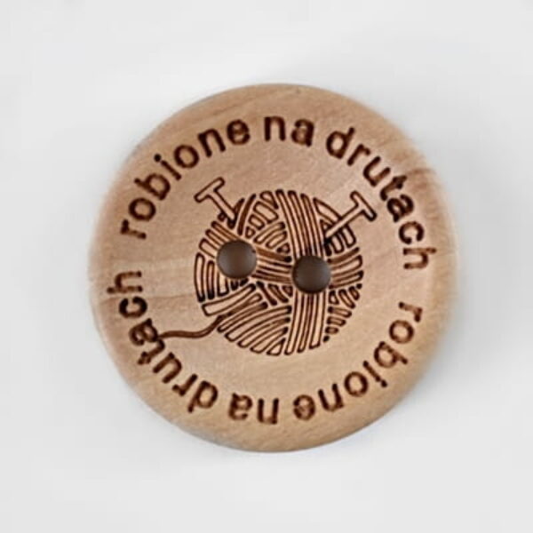 Drewniany guzik z napisem "Robione na drutach" Średnica 25 mm Cena za 1 sztukę