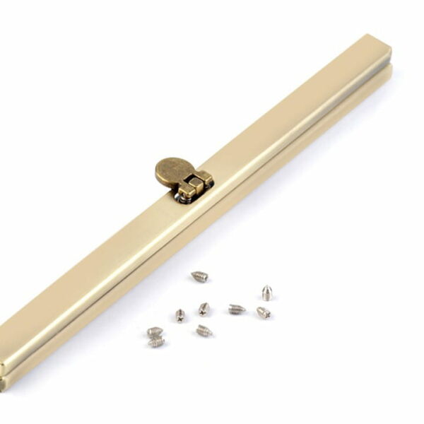 Metalowa ramka z zapięciem do wyrobu torebki. Jest to wkładany typ ramki - materiał wkłada się do środka, mocuje dołączonymi śrubkami (8 sztuk) lub klejem (najlepiej chemoprenowym), następnie kleszczami ściąga się do siebie szczęki ramki. Szerokość: 1 cm Długość: 19 cm Wewnętrzna szerokość ramki do włożenia materiału: 4,5 mm Cena za 1 szt. Zdjęcia produktów są poglądowe i pochodzą ze strony producenta.