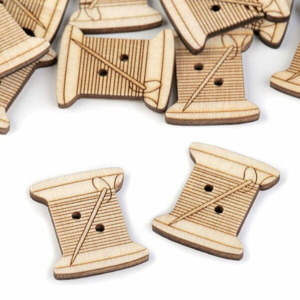 Drewniany guzik szpulka Motyw jest jednostronny. Wymiary: 21 x 26 mm Grubość: 2,3 mm Cena za 1 sztukę