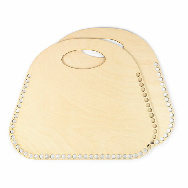 Baza uchwyty do torby do obrabiania sznurkiem, wykonana ze sklejki o grubości 3 mm. Do tej bazy polecamy sznurek bawełniany lub T-shirt Cotton Spaghetti. Bazy można malować farbą akrylową, bejcą, można je też ozdabiać różnymi technikami, m.in. decoupage. Do przerobienia pierwszego rzędu zalecamy użyć szydełka w rozmiarze 6-7 mm, przy kolejnych rzędach możemy używać już większych szydełek. Wymiary: 36 x 30 cm Wymiar otworów: 10 mm Komplet: 2 szt