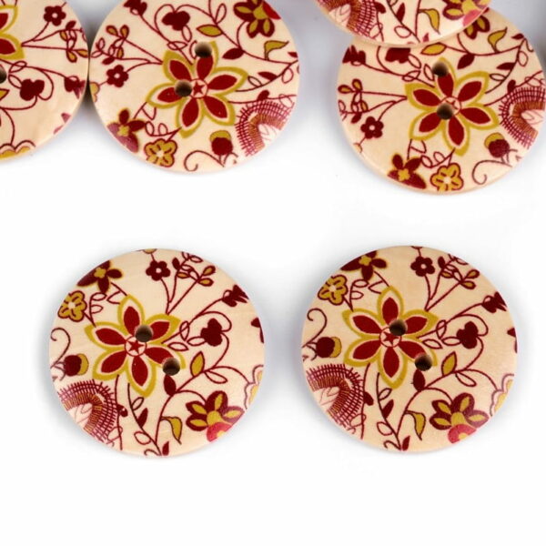 Drewniane guziki z motywami kwiatowymi wyróżnią się na odzieży i dodatkach. Można je naszyć na swetry, kurtki, sukienki i torebki. Średnica: 30,5 mm Producent nie zaleca prania guzików. Cena za 1 sztukę