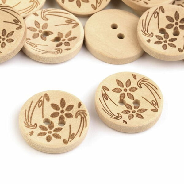 Drewniane guziki nielakierowane z motywami kwiatowymi wyróżnią się na odzieży i dodatkach. Można je naszyć na swetry, kurtki, sukienki i torebki. Średnica: 19,7 mm Producent nie zaleca prania guzików. Cena za 1 sztukę