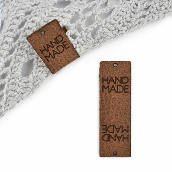 Metka z napisem "HAND MADE". Posiada dwa otwory do przyszycia. Materiał: skóra naturalna Kolor metki: koniak Wymiary: 60 x 20 mm