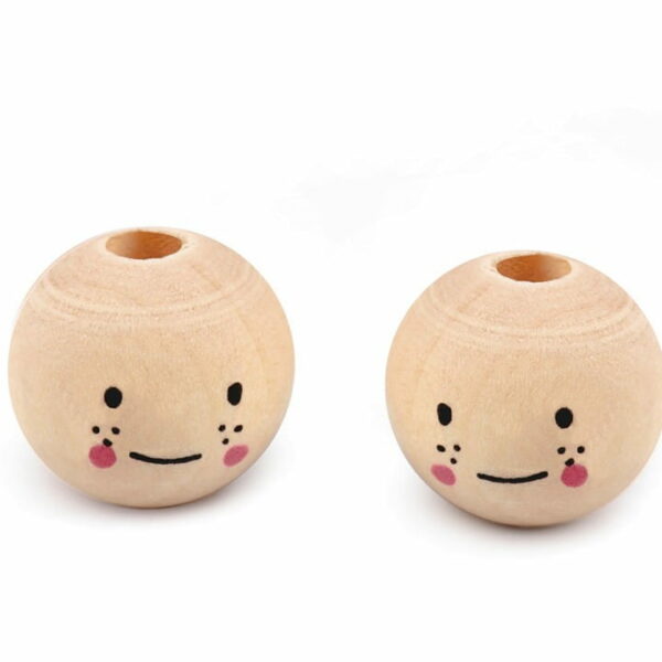 Małe, drewniane koraliki z malowaną buźką. Można z nich stworzyć wesoły naszyjnik, stworzyć pacynki, wesołe piki do doniczki itp. Ze względu na malowanie poszczególne koraliki mogą się od siebie różnić. Struktura oraz kolor drewna również może się różnić. Ze względu na technologię obróbki drewna wokół otworów mogą pojawić się zadziory. Buźka znajduje się z przodu koralika, tył jest naturalny. Produkt nie nadaje się dla dzieci do lat 3. Do tych koralików polecamy sznurek o grubości 2 mm , 3 mm. Należy jednak pamiętać, że średnica otworu ma 3,2 mm i możliwe jest przeciągnięcie pojedynczego sznurka o grubości 3 mm lub kilku cieńszych.