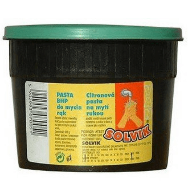 Solvik Pasta Do Czyszczenia BHP 500GWŁAŚCIWOŚCI: doskonale usuwa uporczywe zabrudzenia delikatna dla rąk neutralne pH zawiera składniki nawilżające ekonomiczna w użyciu miły cytrynowy zapach ulega biodegradacji można ją długo przechowywać bez szkody dla jakości ZASTOSOWANIE: Pastę stosuje się na wilgotne ręce myjąc je aż do usunięcia zabrudzeń