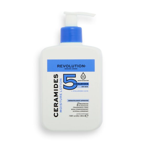 Revolution Skincare Ceramides Moisture Lotion Ceramidowy Krem Nawilżający 236ML Przeznaczony do wszystkich rodzajów skóry i zasilany 5 ceramidami, Revolution Skincare Ceramides Moisture Lotion zawiera kwas hialuronowy, który nawilża i odżywia, otula i uspokaja skórę.5 powodów, dla których Twoja skóra to pokocha:Zawiera supernawilżający kwas hialuronowy zapewniający całodobowe nawilżenieBalsam nawilżający ma lekką konsystencjęNadaje się do każdego rodzaju skóry, ale najlepiej nadaje się do skóry suchejCeramidy łączą się z prawie wszystkimi innymi składnikami pielęgnacyjnymi skóry, dzięki czemu tę formułę można łatwo zastosować w każdej rutynie.Każda formuła w gamie jest zatwierdzona przez dermatologa.Czym są ceramidy? Ceramidy to długołańcuchowe kwasy tłuszczowe, które stanowią około 50% składu skóry – są niezbędne do budowania struktur w skórze, kleju spajającego skórę. Kiedy wrażliwa bariera skórna jest uszkodzona, cera może być sucha, skłonna do podrażnień lub narażona na skażenie mikrobiologiczne. Ceramidy zapewniają ochronę bariery skóry, zatrzymują wilgoć, a cera jest miękka i elastyczna.Gama Ceramidów to:Certyfikat Peta cruelty-free i wegańskiZatwierdzony przez dermatologaBez zapachuNie zatyka porówHipoalergicznyJak używać: Nakładaj niewielką ilość na twarz rano i wieczorem. Aby uzyskać najlepsze rezultaty, stosuj rutynowo wraz z gamą produktów czyszczących Ceramides.