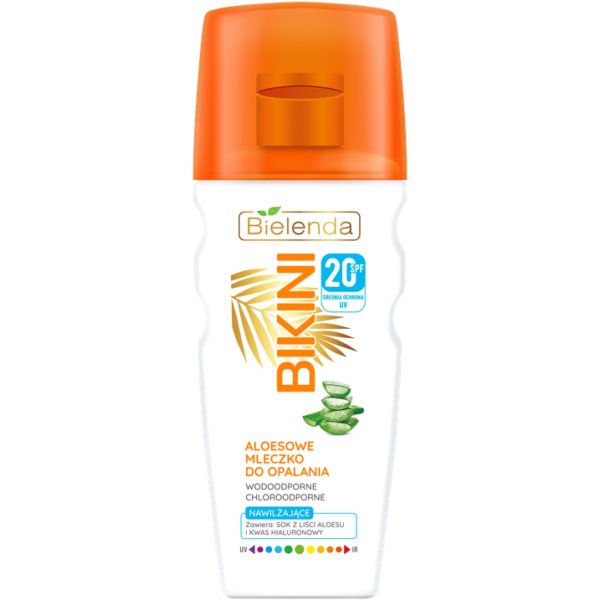Bielenda Bikini Wodoodporne Mleczko Aloesowe Do Opalania SPF20 200ML Mleczko dzięki swojej lekkiej formule szybko się wchłania. W składzie znajduje się sok z liści aloesu który łagodzi oraz kwas hialuronowy, który zapewnia nawilżenie. Kosmetyk zmniejsza ryzyko powstawania przebarwień skórnych, zapewnia wysoką ochronę UV+IR+HEV. Pozostawia uczucie gładkiej, jedwabistej oraz miękkiej skóry.Cechy i właściwości mleczka do opalania Bielenda Bikini:wodoodporne,chloroodporne,lekka formuła,szybko się wchłania,zmniejsza ryzyko powstawania przebarwień,zawiera sok z liści aloesu oraz kwas hialuronowy,SPF20 zapewnia średnią ochronę UVSposób użycia: Mleczko rozprowadzić obficie i równomiernie na skórze przed opalaniem, pozostawić do wchłonięcia. Dla utrzymania maksymalnej ochrony aplikację kilkakrotnie powtórzyć w czasie plażowania oraz po kąpieli, spoceniu się lub wycieraniu ręcznikiem.Ważna uwaga: Nawet przy stosowaniu produktu ochrony przeciwsłonecznej niewskazane jest długotrwałe przebywanie na słońcu. Chroń niemowlęta i dzieci przed bezpośrednim światłem słonecznym. Nadmierne przebywanie na słońcu stanowi poważne zagrożenie dla zdrowia. Produkt nanieść przed wyjściem na słońce. Nanosić ponownie dla utrzymania ochrony, zwłaszcza po spoceniu się, pływaniu lub wycieraniu ręcznikiem.