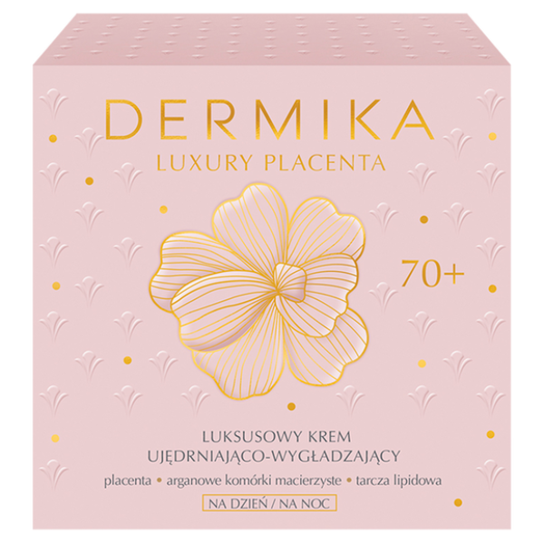 Dermika Luxury Placenta Luksusowy Krem Ujędrniająco Wygładzający Dzień/Noc 70+ 50ML Kosmetyk przenosi pielęgnację twarzy w inny, doskonalszy wymiar, skutecznie zatrzymuje czas i poprawia wygląd skóry dojrzałej. Gęsta i kremowa formuła wzbogacona bogactwem składników aktywnych, pozwala cieszyć się piękną i jędrną skórą bez względu na wiek. Dodatkowo przywracają skórze energię i reaktywują jej mechanizmy witalne. Podwójne działanie przeciwzmarszczkowe zapewnia innowacyjne połączenie roślinnej placenty z komórkami macierzystymi z drzewa arganowego, które stymulują skórę od wewnątrz, pobudzając w niej procesy regeneracyjne i zdolność do samonaprawy. Przeznaczony jest do pielęgnacji skóry dojrzałej po siedemdziesiątym roku życia.Składniki aktywne:roślinna placenta 2% o wyjątkowych właściwościach regeneracyjnych, wspiera syntezę kolagenu III - zwanego „kolagenem młodości'. Poprawia, odżywienie i nawilżenie skóry.komórki macierzyste z drzewa arganowego o działaniu przeciwstarzeniowym, wspierają witalizację i ochronę komórek macierzystych skóry. Cera jest wzmocniona i ujędrniona, a zmarszczki zostają zredukowane.tarcza lipidowa 2% to połączenie koenzymu Q10 z witaminą E, aby chronić barierę lipidową naskórka oraz włókna kolagenowe przed degradacją, aby skóra zachowała jędrność i blask.masło shea 3,8% bogate źródło kwasów tłuszczowych o właściwościach odżywczych i nawilżających. Doskonale zabezpiecza przed czynnikami zewnętrznymi, zmniejszając podatność skóry na podrażnienia.Cechy i właściwości luksusowego kremu ujędrniająco-wygładzającego Dermika Luxury Placenta:poprawia jędrność i elastyczność,zmniejsza głębokość zmarszczek,wygładza skórę,zmniejsza uczucie suchościLuksusowy krem ujędrniająco-wygłądzający 70+, dla wymagającej skóry po siedemdziesiątym roku życia wspomaga regenerację i odżywienie. Poprawia sprężystość i napięcie skóry, sprawia, że cera wygląda na wypoczętą, a bogata konsystencja niweluje uczucie ściągnięcia.Stosowanie: Codziennie rano i wieczorem nałóż na oczyszczona skórę twarzy, szyi i dekoltu, delikatnie wmasuj.