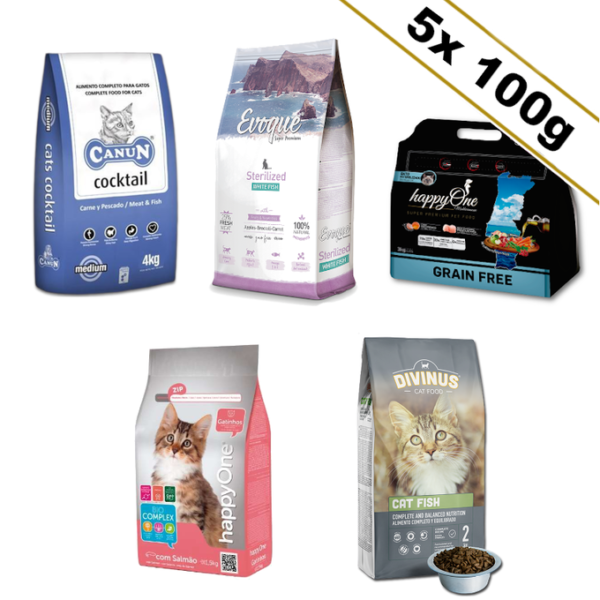 Zestaw startowy dla kota 5 próbek karmy x150gPRÓBKA Canun Cats Cocktail bogata w drób(25%) i olej rybny 150gto niezwykle smaczna i lekkostrawna karma, uwielbiana przez zwierzaki! Przygotowano ją z myślą o wszystkich kotach, niezależnie od ich wieku, rasy i wielkości. Bogaty skład Canun Cats Coctail, obfitujący w zbilansowane białko, włókno, witaminy i substancje mineralne, stanowi gwarancję zdrowego rozwoju Twojego pupila oraz jego dobrego samopoczucia. Sięgając po tę markę wybierasz więc nie tylko doskonały produkt w przystępnej cenie, ale i zdrowie oraz szczęście swojego zwierzaka.Składniki analityczne:Białka (%)31 %Surowe oleje i tłuszcze (%)12 %Błonnik (%)2,4 %Surowy popiół (%)7 %Wilgotność (%)10 %Wapń (%)1,21 %Fosfor (%)0,9 %Sód (%)Tauryna:0,45 %1200 mg/kgWitamina A16,500 U.I/kg.Witamina D-31.900 U.IWitamina E150 mg/kg.Miedź15 mg/kgPrzeciwutleniacz E320150 mg/kgPRÓBKA Evoque Cat Sterilised Biała Ryba Super Premium - próbka 150gSKŁAD: Swieża biala ryba (25% Suszona biała ryba, tunczyk (12%), Gluten z kukurydzy, Groszek, Kukurydza, Pulpa buraczana Drożdże, Białko z groszku, Hydrolizat mięsa z kurczaka, Hydrolizat wątróbki kurczaka, Bialko ryżowe, Olej z kurczaka, Suszone jablko (0,5%), Suszone brokuly (0,1%), Suszona marchewka (0,1%), Cykoria (0,1%, żródlo FOS), YUCA SchidigeraSKLADNIKI ANALITYCZNE:Bialko surowe 36,00%Oleje i tluszcze surowe 11,00%Kwasy tłuszczowe omega-3 0,4%Kwasy tłuszczowe omega-6 2%Blonnik surowy 3,95%Popioł surowy 8,00%Wapń 1,15%Fosfor 1,05%.DODATKI:DIETETYCZNEWitamina A 18000 jm/kg, Witamina D3 1450 jm/kg, Witamina E 175 mg/kg, Żelazo (siarczan żelazowy jednowodny) 75 mg/kg, Jod (jodek potasu) 3,50 mg/kg, Miedz (pięciowodny siarczan miedziowy) 10 mg/kg, Mangan (monohydrat siarczanu manganu) 7,50 mg/kg, Cynk (tlenek cynku) 150 mg/kg, Selen (selenian sodu) 0,15 mg/kg, Tauryna 1100 mg/kg, L-karnityna 200 mg/kg.TECHNOLOGICZNE: Substancje przeciwutleniajace: Ekstrakty z tokoferoli z olei roślinnych (1.60 mg/kg). Regulatory kwasowości: Wodorosiarczyn sodowy (5000 mg/kg).SPOSOB UZYCIA: Zmiana karmy powinna odbywać się stopniowo przez 7 dni. Podawać karme 2 razy dziennie. Nie wykorzystywać porcji pozostałej z poprzedniego dnia. Ilość koniecznej karmy może się różnić w zależności od aktywności, rasy kota i warunków środowiskowych Koty powinny mieć zawsze świeżą czystą wodę. Numer partii, „Najlepiej wykorzystać przed;" Numer rejestru oraz waga netto są wydrukowane na opakowaniu. Przechowywać w chłodnym i suchym miejscu.HAPPYONE GRAIN-FREE MEDITERRANEUM STERILISED CAT DLA KOTÓW PO STERYLIZACJI - próbka 150gZdrowa bezzbożowa karma dla kotów po sterylizacji. Zawarte w składzie wyłącznie naturalne składniki doskonale wpływają na samopoczucie i sierść naszego czworonoga. Specjalna formuła karmy chroni kocie nerki i zapobiega ich schorzeniom. Karma ma również właściwości odkłaczające. Skład:Zawartość mięsa 70%, w tym: świeże mięso drobiowe (30%), suszone mięso drobiowe, bataty, suszone białko z sardynek (18%), suszone białko drobiowe, świeże jajka (6%), tłuszcz drobiowy, witaminy i minerały, wysłodki buraczane (2%), groszek, włókna trzciny cukrowej, naturalne przeciwutleniacze (rozmaryn, czarna porzeczka, granat), oliwa z oliwek, suszone jabłko, suszona marchew, suszony pomidor, drożdże (źródło mannano-oligosacharydów 500 mg/kg), ekstrakt z Yucca Schidigera (250 mg/kg)Dodatki:Witaminy:E672 Witamina A 30,000 UI/kgE671 Witamina D3 2,000 UI/kgWitamina E (Alfa-tokoferol) 500 mg/kgB1 Tiamina 45 mg/kgB2 Ryboflawina 25 mg/kgB6 Pirydoksyna 20 mg/kgB12 Cyjanokobalamina 120 mg/kgBiotyna 1,5 mg/kgPierwiastki i minerały:E1 Żelazo 60 mg/kgE2 Jod 1,2 mg/kgE4 Miedź 10 mg/kgE5 Mangan 25 mg/kgE6 Cynk 80 mg/kgCynk organiczny (chelat cynku) 40 mg/kgE8 Selen 0,2 mg/kgRegulatory kwasowościPrzeciwutleniaczeAminokwasy:Tauryna 1,500 mg/kgDL-metionina 2,000 mg/kgSkładniki analityczne:Białko 30%Oleje i tłuszcze 18%Popiół 7,5%Włókna 3%Kwas tłuszczowy Omega-3 0,4%HAPPYONE KITTEN DLA KOCIĄT - próbka 150gKompletna karma dla kotów w wieku do 12 miesięcy, z łososiem - naturalnym źródłem kwasów tłuszczowych Omega 3.Zawiera kompleks witamin, który promuje zdrowy układ moczowy i optymalne pH moczu, a także dobre funkcjonowanie układu sercowo-naczyniowegoSkład:Pszenica, odwodnione białko drobiowe (26% kurczaka), tłuszcz drobiowy, kukurydza, gluten, mączka z łososia (4%), kukurydza, plazma wieprzowa, hydrolizowane biało drobiowe, minerały, wysłodki buraczane (2%), drożdże (źródło MOS 625 mg / kg), Yucca schidigera (150 mg / kg).PRÓBKA Divinus Cat Fish 150gPełnowartościowa karma dla kotów dorosłych. Duża zawartość mięsa zapewnia wysoką smakowitość karmy.Ilość podawanej karmy jest zależna jest od aktywności, rasy kota oraz warunków środowiskowych. Skład:Zboża (44%), produkty pochodzenia zwierzęcego (36%, w tym 16% kurczaka) tłuszcz drobiowy (5%), wysłodki buraczane(2,5%) hydrolizowane białko zwierzęce (2%), mączka rybna (4%), wysokoprzyswajalne białko, chlorek sodu,drożdze piwne, gmo.Dodatki / kg: Witaminy: 3a672a Witamina A: 18