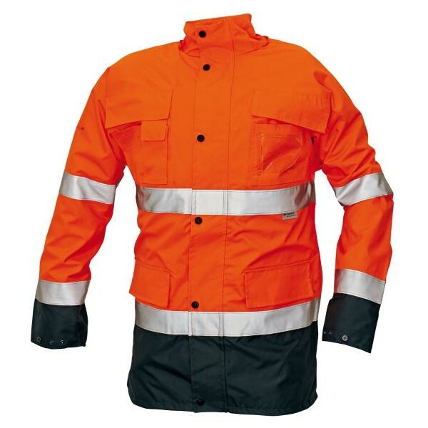 Kurtka ocieplana wysokiej widoczności 2w1 MALABARMęska kurtka z taśmami odblaskowymi Hi-Vis.wodoodporna i oddychająca, odpinana polarowa podszewka,kaptur ocieplany polarem, odpinany na suwak,klejone szwy,wewnętrzne, dzianinowe mankiety,wodoodporność 3 klasy i paroprzepuszczalność 1 klasy zgodnie z normą EN 343.Tkanina: zewnętrzna: 100% poliester z powłoką poliuretanową (PU); ocieplina: 100% poliester; podszewka: polar, 100% poliester.Kolor: żółto-granatowy (wyprzedaż), pomarańczowo-granatowy.Zgodność z rozporządzeniem UE 2016/425 w sprawie środków ochrony indywidualnej EN ISO 13688:2013 Ogólne wymogi dotyczące odzieżyEN 343 Odzież chroniąca przed opadami atmosferycznymi 3 Wodoszczelność (od 1 do 3) 1 Przenikanie pary wodnej (od 1 do 3)EN ISO 20471 Odzież o intensywnej widzialności (ostrzegawcza) 3 Klasa widzialności (od 1 do 3) Jednostka sprzedaży: 1 sztuka.