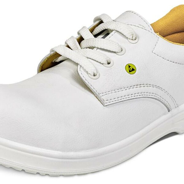 Półbuty zawodowe RAVEN ESD O1 SRCPółbuty do pracy w strefach ESD bez podnoska.Oddychająca cholewka wykonana z wysokiej jakości mikrofibry.Przewiewna podszewka poliestrowa.Antystatyczna, antypoślizgowa i olejoodporna podeszwa z PU o pojedynczej gęstości.Amortyzacja energii części piętowej. Kolor: czarny, biały.Zgodność z rozporządzeniem UE 2016/425 w sprawie środków ochrony indywidualnej EN ISO 20347 Wymagania dotyczące obuwia zawodowego O1 Wymagania podstawowe + zamknięta pięta + antyelektrostatyczność + podeszwa odporna na węglowodory + absorbcja energii w obszarze pięty SRC Odporność na poślizg na różnych podłożachEN 61340-4-3:2001 Elektryczność statyczna. Metoda określania rezystancji elektrycznej obuwia używanego do zapobiegania naelektryzowaniu ciała człowieka.EN 61340-5-1:2007 Elektryczność statyczna. Ochrona przyrządów elektronicznych przed elektrycznością statyczną. Jednostka sprzedaży: 1 para.