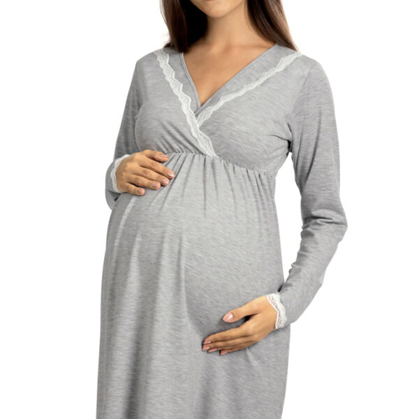 Koszula ciążowa i do karmienia z długim rękawem. Dekolt w kopertę, umożliwiający swobodne karmienie maluszka. Pod biustem wszyta gumka, podtrzymująca biust. Skład surowcowy: 70% Wiskoza, 20% Elastan, 10% Poliamid