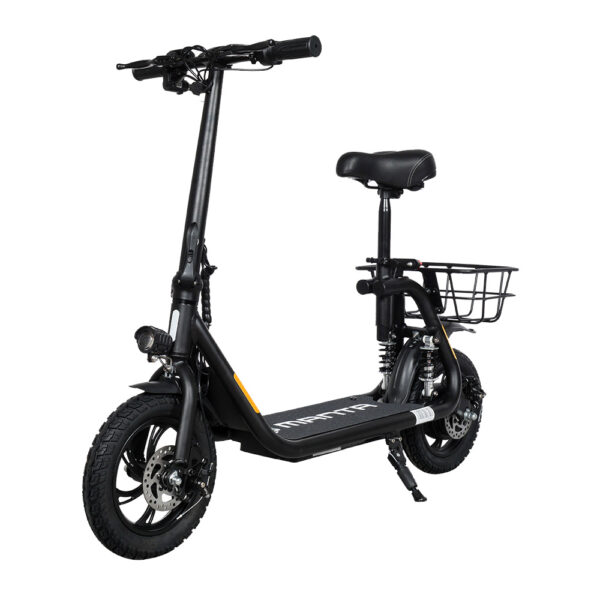 Funkcje:Amortyzowana tylna ośDuże pompowane koła 12” zapewniające dodatkową amortyzacjęBardzo pojemna bateria 8Ah zapewniająca zasięg do 30 km*Silnik 250WStacyjka, dwa kluczyki w zestawieHamulce tarczowe tył i przódKoszyk na zakupyOświetlenie LED przód i tyłRama aluminiowa lekka i wytrzymała z indywidualnym numerem seryjnymSkładana rączka i demontowane siedzenieWymiary: 124 x 93 x 49.5 cmKolor: CzarnyKoszyk na zakupyBardzo pojemna bateria 8Ah zapewniająca zasięg do 30 km*Duże pompowane koła 12” zapewniające dodatkową amortyzacjęZestaw zawiera:SkuterKoszyk do zamontowaniaSiedzenie do zamontowaniaŁadowarkaInstrukcja obsługiManta oferuje nowy produkt dla swoich wymagających Klientów. Wygodny Skuter elektryczny MES1202H wyposażony w składaną rączkę i demontowane siedzenie ułatwi wszystkim drogę do pracy . Dodatkowym wyposażeniem jest koszyk, w którym każdy użytkownik będzie mógł przewieźć np. codzienne zakupy, czy też kocyk i napoje na piknik. Duże pompowane opony 12” zapewnią odpowiednią amortyzację, która pozwoli na wygodną jazdę po wszystkich powierzchniach Skuter posiada pełne oświetlenie LED dzięki czemu będziesz zawsze dobrze widoczny, a podróż po zmroku będzie bezpieczna. Dodatkowo został wyposażony w podwójne hamulce tarczowe dzięki czemu droga hamowania jest wyjątkowo krótka.Specyfikacja techniczna:Pojemność Baterii: 8 Ah / 36VŚrednica kół: 12"śRodzaj opon: PompowaneMoc Silnika: 250 WMaks. Prędkość: 25 km/hMaks. Zasięg: 30 km*Hamulce: TarczoweAmortyzacja: TAKMaks. waga użytkownika: 120 kgOświetlenie LED: Tak, przód i tyłTylne światło STOP: TakRegulowana wysokość rączki: NieMaksymalny kąt jazdy: 7.2°Podpórka: TakWaga Netto: 17.5 kgWaga brutto: 21.2 kgWymiary po rozłożeniu (Dł x Wys x Szer): 124 x 93 x 49.5 cmWymiary po złożeniu (Dł x Wys x Szer): 124 x 54 x 33 cmZasilanie sieciowe: AC 100-240V 50/60HzParametry Ładowania: DC 42V, 1.5ACzas ładowania: 5-6 hKlasa wodoszczelności: IPX4Dodatki: Możliwość wykorzystania zabezpieczenia antykradzieżowego, stacyjka z kluczykami, kosz do przewożenia, hamulec tarczowy tył i przód.Dodatkowe informacje: * Zasięg zależy od wielu czynników: prędkości jazdy, wagi użytkownika, rodzaju terenu, zastosowania oświetlenia w pojeździe, temperatury zewnętrznej oraz stylu jazdy.