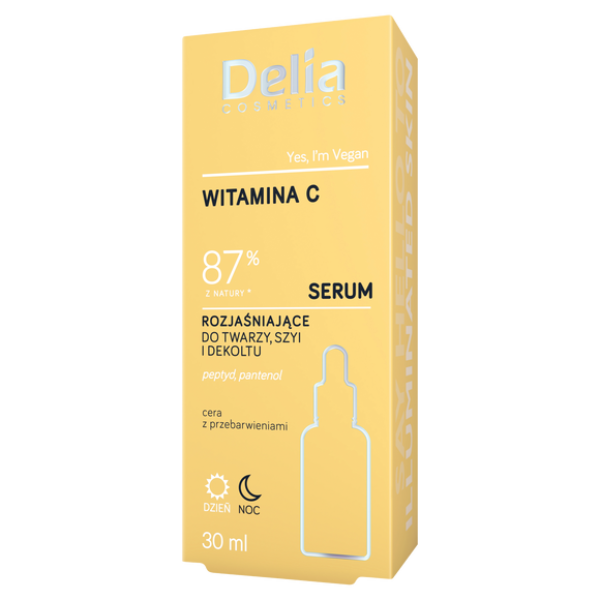 Delia Serum Rozjaśniające Do Twarzy, Szyi i Dekoltu z Witaminą C 30ML Skoncentrowany kosmetyk charakteryzuje się większym stężeniem aktywnych składników niż zwykły krem. Serum optycznie wyrównuje koloryt, redukuje widoczność drobnych przebarwień. Gwarantuje nawilżenie skóry, wygładza ją oraz zmniejsza widoczność zmarszczek. W składzie znajduje się liposomalna witamina C, peptyp oraz panthenol. Serum przeznaczone jest do pielęgnacji cery z przebarwieniami oraz nierównym kolorytem. Cechy i właściwości rozjaśniającego serum do twarzy, szyi i dekoltu Delia Cosmetics:wyrównuje koloryt skóry,redukuje widoczność drobnych przebarwień,nawilża i wygładza,zmniejsza widoczność zmarszczek,rozświetla,zawiera 87% składników pochodzenia naturalnegoStosowanie: Nanieś serum na oczyszczoną skórę twarzy, szyi i dekoltu.