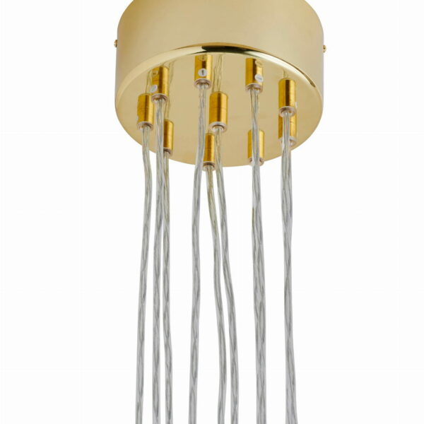 Średnica: 20 cm Wysokość: 5 cm Ilość otworów: 10, do wypuszczenia 10 kabli (kable przychodzą z lampami) Kolor: złoty, lekko błyszczący