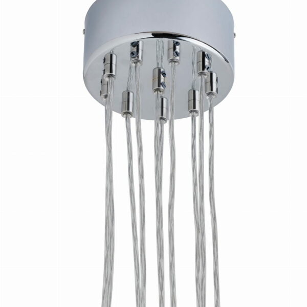 Średnica: 20 cm Wysokość: 5 cm Ilość otworów: 10, do wypuszczenia 10 kabli (kable przychodzą z lampami) Kolor: srebrny, lekko błyszczący