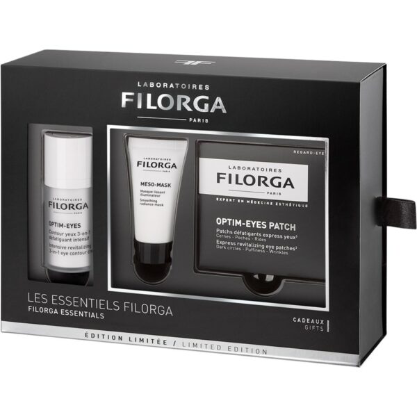 Les Essentiels Filorga Gifts - Zestaw Pielęgnujący Skórę Oczu. Zestaw kosmetyków pod oczy pozwala na kompleksową pielęgnację skóry okolicy oczu. Usuwa oznaki zmęczenia, cienie i obrzęki, rozświetla, nadając spojrzeniu blasku. Kosmetyki redukują zmarszczki, silnie nawilżając skórę i ujędrniają.Poniżej szczegółowy opis produktów, jakie znajdują się w zestawie:Optim-Eyes Anti-Fatigue Eye Cream - Głęboko regenerujący żel do skóry wokół oczuKrem konturujący pod oczy, który : 1. redukuje cienie wokół oczu: unikalny kompleks eliminuje pigment odpowiedzialny za ich powstawanie. 2. redukuje opuchnięcie skóry wokół oczu: zmniejszenie opuchnięcia dolnej powieki dzięki składnikom aktywnym pobudzającym krążenie limfatyczne i żylne. 3. usuwa zmarszczki i przeciwdziała oznakom starzenia: NCTF® oraz kwas hialuronowy odbudowują skórę. Aż 3 składniki drenujące wygładzają skórę okolic oczu, abyś mogła cieszyć się promiennym, świeżym spojrzeniem.Wskazania: cienie pod oczami, opuchnięta skóra okolic oczu, zmarszczki, niedostateczny poziom nawilżenia, skóra szara i zmęczona Pojemność: 15mlMeso Mask Anti-Wrinkle Lightening - Przeciwzmarszczkowa maseczka rozświetlająca Rozświetlająca unikalna maska przeciwzmarszczkowa, która kompleksowo poprawia kondycję skóry. Przeciwdziała powstawaniu zmarszczek, błyskawicznie usuwa oznaki zmęczenia, sprawia, że skóra staje się promienna i pełna blasku. Zawarty w delikatnej konsystencji maski - polisacharyd, wyrównuje jej koloryt, rozświetla i łagodzi podrażnienia. Możesz długotrwale możesz cieszyć się efektami jego głębokiego działania. Zawarty w maseczce polirewitalizujący kompleks przeciwstarzeniowy stosowany w kuracji anti-aging przywraca gęstość skóry.Wskazania: zmarszczki, skóra zmęczona i szara, nierówny koloryt, podrażnienia, utrata gęstości skóry Pojemność: 15mlOptim-Eyes Patches - Płatki pod Oczy Redukujące ZmęczeniePłatki pod oczy ekspresowo niwelują oznaki zmęczenia - już w 15 minut skóra wygląda świeżo, odzyskuje jędrność a cienie pod oczami znikają. Składniki odżywcze regenerują skórę i odnawiają naczynia krwionośne. Roślinne ekstrakty wygładzają skórę i redukuję nieestetyczne obrzęki skóry. Skóra jest ujędrniona, sprężysta i elastyczna, Płatki zapewniają odmłodzony wygląd i promienne spojrzenie.Wskazania: cienie pod oczami, wiotka skóra, obrzęki, zmarszczki, niedostateczny poziom nawilżenia, potrzeba odżywieniaPojemność: 2 płatki (na jedną aplikację)