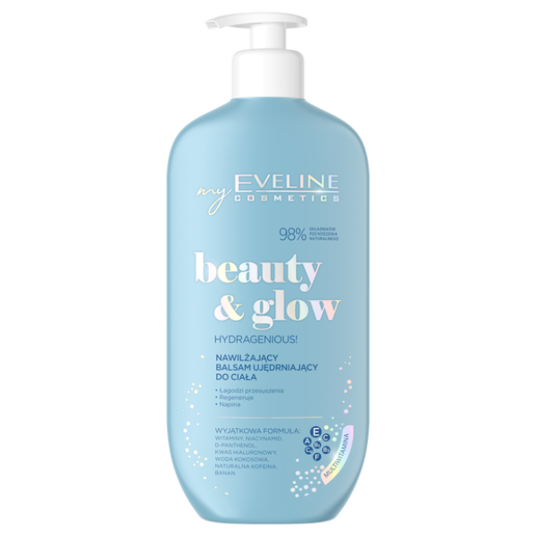 Eveline Beauty&Glow Nawilżający Balsam Ujędrniający Do Ciała 350ML Mieszanka ukryta w balsamie to klucz do odpowiedniej pielęgnacji ciała! Kompleks witamin (A, E, C, Cg, B3, B5 i F) zadba o doskonałe odżywienie i nawilżenie skóry. Woda kokosowa sprawi, że ciało stanie się przyjemnie gładkie. Naturalna kofeina pobudzi skórę do działania i poprawi jej elastyczność, a banan zatroszczy się o regenerację naskórka. Kwas hialuronowy zadba o to, żeby skóra była optymalnie nawodniona i ukojona. Dzięki formule balsamu Twoje ciało zyska komfort i stanie się przyjemnie wygładzone!Nawadnia i regenerujeRewitalizuje i wygładzaOdżywia i koiPoprawia jędrnośćDla skóry suchej i podatnej na podrażnieniaZawiera skuteczne składniki aktywneAż 98% składników pochodzenia naturalnegoProdukt wegańskiStosowanie: Balsam zaaplikuj na skórę całego ciała.