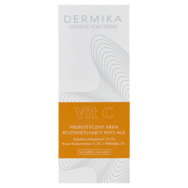 Dermika Esthetic Solutions Prebiotyczny Krem Rozświetlający Dzień/Noc 50ML DERMIKA ESTHETIC SOLUTIONS to zaawansowana linia preparatów przeciwzmarszczkowych, bazująca na profesjonalnych składnikach aktywnych o super mocy, stosowanych w wysokich, gabinetowych stężeniach, wyselekcjonowanych przez kosmetologów do osiągnięcia wyższego poziomu estetyki i jakości skóry. Kosmetyki Esthetic Solutions, inspirowane medycyną estetyczną, są nastawione na osiągnięcie długotrwałych efektów bez uczucia dyskomfortu. Odkryj na nowo pełną promienności i blasku skórę dzięki preparatom Dermika Esthetic Solutions Vit C, które skutecznie, w profesjonalny, udowodniony badaniami aparaturowymi sposób przeciwdziałają starzeniu się skóry i poprawiają jej wygląd.Skuteczność kremu potwierdzona badaniami aparaturowymi:Już po 4 tygodniach stosowania:Zmniejsza długość i głębokość zmarszczek: 90 %Spłyca zmarszczki, nawet 0: -28 %Zmniejsza długość zmarszczek, nawet o: -34 %Poprawia jędrność oraz koloryt cery: 95 %Bogata formuła Prebiotycznego kremu rozświetlającego anti-age Vit C natychmiast przywraca komfort cerze. Zawiera stabilną witaminę C, która wzmacnia siłę naturalnego systemu obronnego i spowalnia starzenie się skóry poprawiając jej jakość i koloryt, przeciwdziała efektom fotostarzenia, chroniąc naskórek przed destrukcyjnym działaniem wolnych rodników. Krem zmniejsza widoczność zmarszczek, ujędrnia, ładnie napina i wygładza, przywraca cerze promienność i blask, intensywnie nawilża.Skuteczność preparatów ESTHETIC SOLUTIONS wynika z wysokich, gabinetowych stężeń skutecznych składników aktywnych o udowodnionym działaniu, zawartych w innowacyjnych profesjonalnych recepturach.Stabilna witamina C 0,1% naśladuje wewnętrzny system obronny skóry i wraz z witaminą E tworzy sieć antyoksydantów. Stymuluje syntezę kolagenu, dzięki czemu skóra staje się bardziej jędrna, o ujednoliconym kolorycie i wygląda młodziej.Kwas hialuronowy 0,2% wspomaga procesy natychmiastowego i długotrwałego nawilżenia skóry, skutecznie uelastycznia, redukuje szorstkość skóry i poprawia mikrorzeźbę naskórka, dzięki czemu zapewnia bardziej gładką, młodziej wyglądającą cerę.Prebiotyk 2 % stanowi suplement dla mikrobiomu skóry, wspierając jej zdrowy wygląd i ochronę przed podrażnieniami.Stosowanie: Codziennie rano i wieczorem wmasuj krem w oczyszczoną skórę twarzy, szyi i dekoltu. Rekomendujemy wykonanie automasażu nakładając krem od dołu, zaczynając od strefy dekoltu i kierując się ku górze. Krem stanowi doskonałą bazę pod makijaż. Dla osiągnięcia maksymalnych efektów polecamy łączne stosowanie kremu oraz serum z linii DERMIKA Esthetic Solutions Vit C.